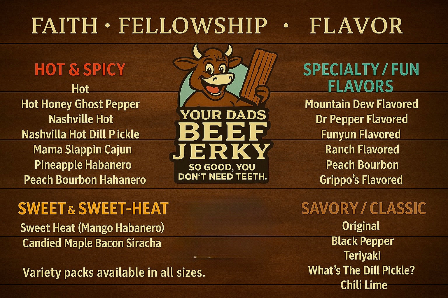 I can remember growing up, I would always smell the aroma of beef jerky and baked goods coming from our kitchen. Dad Began making beef jerky as a hobby, right along with him with my mom was helping cook up the recipes. Eventually, jerky was a big hit with friends and family, and they began to make it out of the love of putting smiles on people faces and good jerky in their bellies. When I was in the military, my mom and dad would send care packages full of baked goods and beef jerky. Whenever my platoon would see me eating the beef jerky they would ask “is that your beef jerky”therefore the name of the company began, dad had a full time job so he never proceeded with the company…today we carry the same spirit to put smiles on faces, and Good jerky in your bellies. Our slogan came from an uncle who was in the crawlspace, doing some housework, who does not have teeth, as we were coming up with slogans, he pops up the crawlspace and says “I’m eating it without teeth, It is so good” therefore the slogan was born. We believe first of all the Lord and savior so we put our faith first, next we value our family, our friends, our community anyone who we can have communion or fellowship with, and we believe that powerful mouth punching, taste bud smacking, flavor is a must…therefore our motto is FAITH FELLOWSHIP FLAVOR